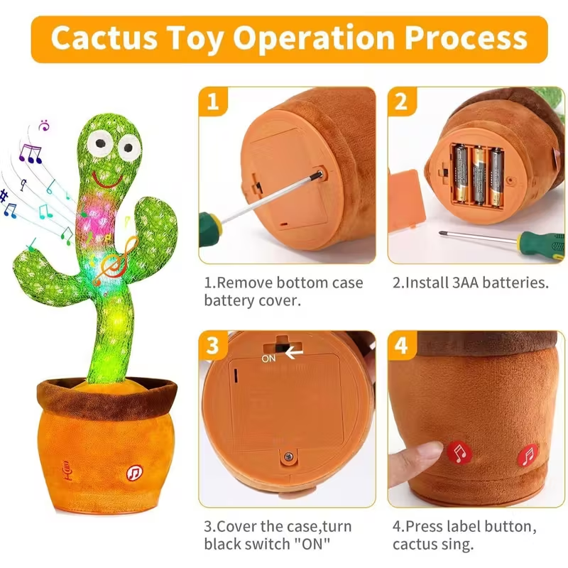 【Easy to use】Insert the battery and turn on the power,Press the button,the cactus plush toy will swing and sing cheerful songs. Battery powered; requires 3 AA batteries (not included).